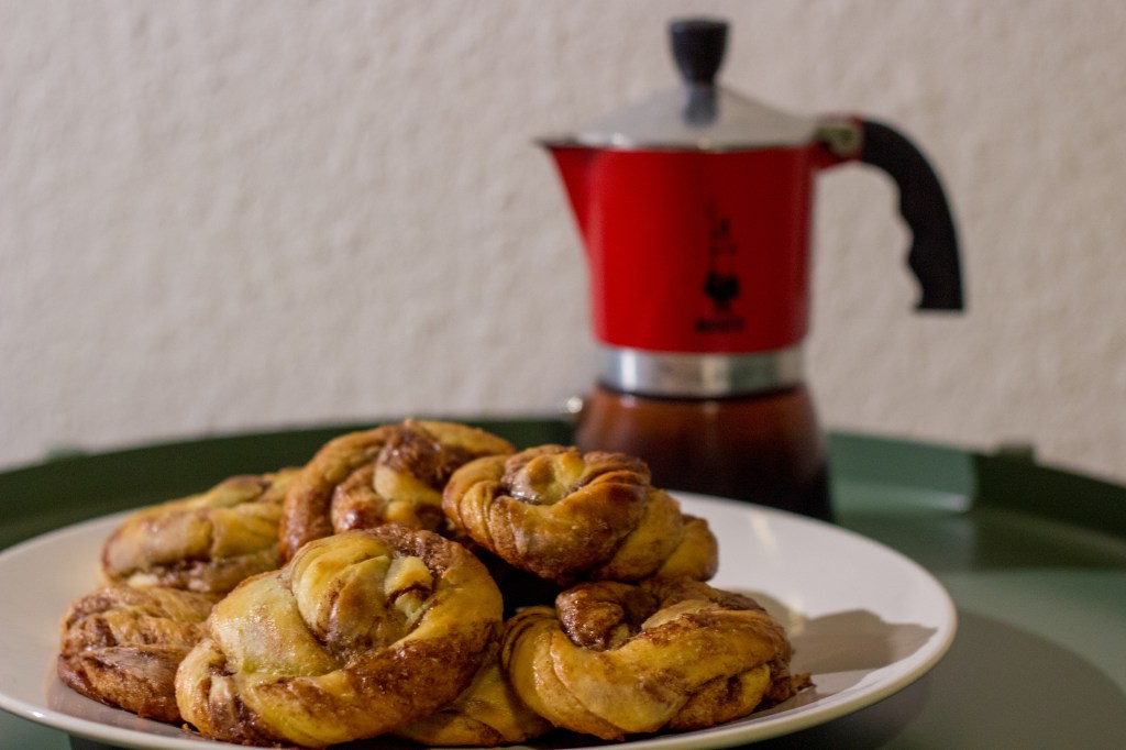 Cut the dough into strips of around 2 centimeters wide. Take a strip at each of the ends and twist around itself. Then, role it twice around your fingers into a double circle and tug the end into the middle, like a knot. Do this with all the strips of dough and place them on a tray with baking paper. Let them proof for another 45 minutes. When the second proofing time has almost passed, pre-heat your oven to 180°C. Just before putting the buns in the oven, whisk the egg in a small bowl and give all buns an egg wash. Bake them for 15 to 20 minutes, until golden brown.
