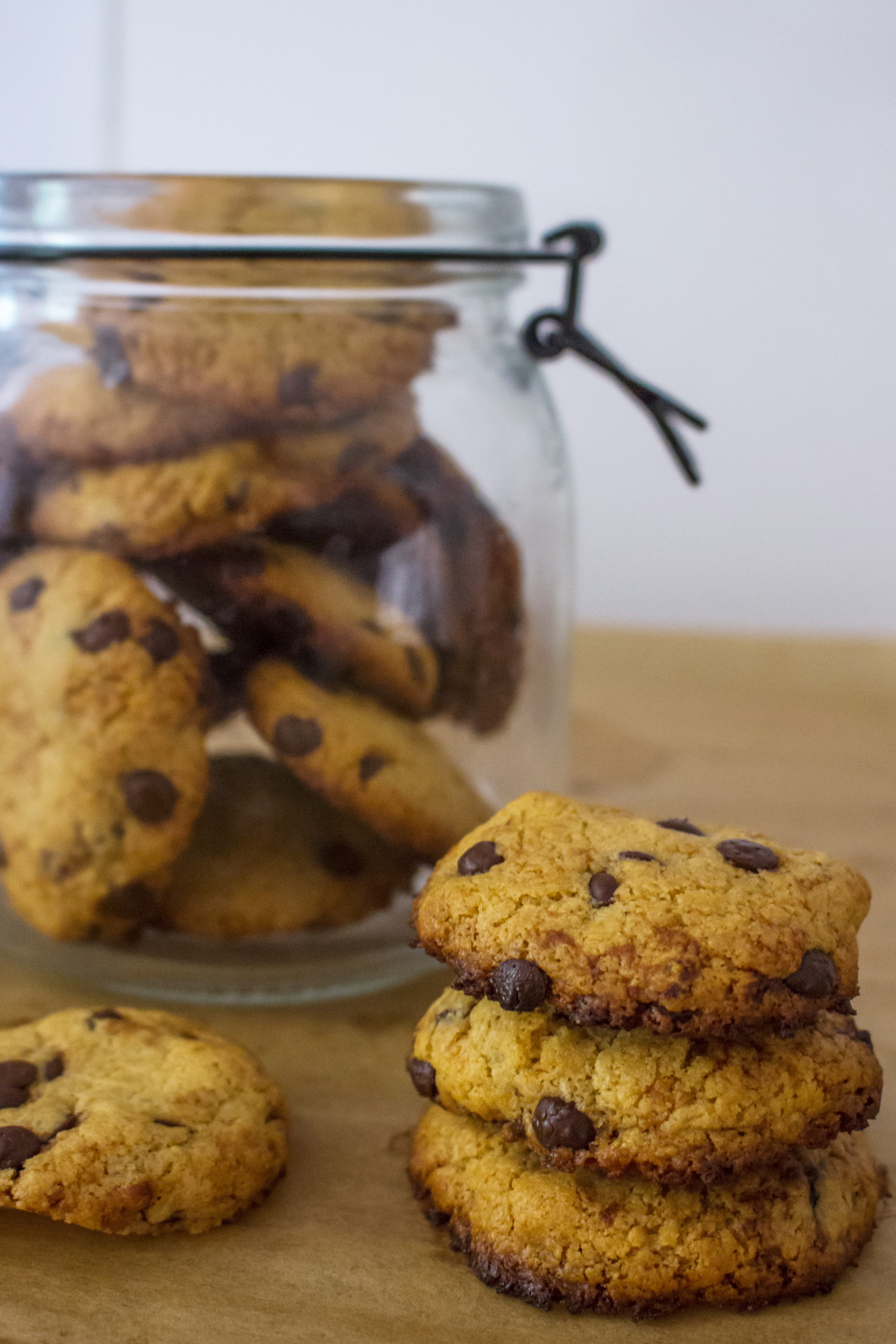 Cover two baking trays with baking paper. If, like me, you only have one tray you can just bake the cookies in two batches. Take half the cookie dough and roll 8 bolls out of it. Press those down into disks of between 0.5 and 1 cm thick. Place with enough space in between on a baking tray. Repeat the same with the other half of the dough and place on the other tray. Once all cookies have been shaped, place them in the oven for 10 to 12 minutes, until the edges are golden brown and the kitchen starts to smell like cookies.