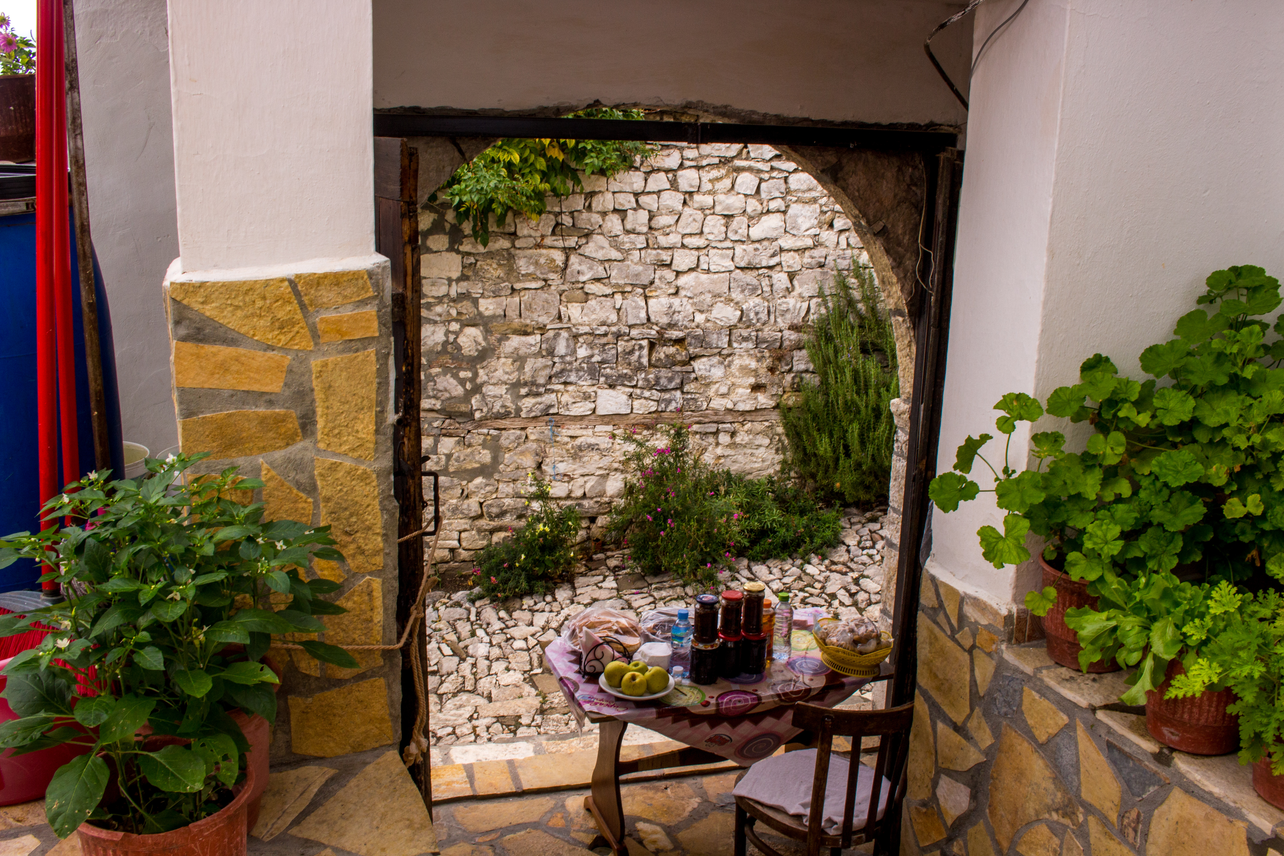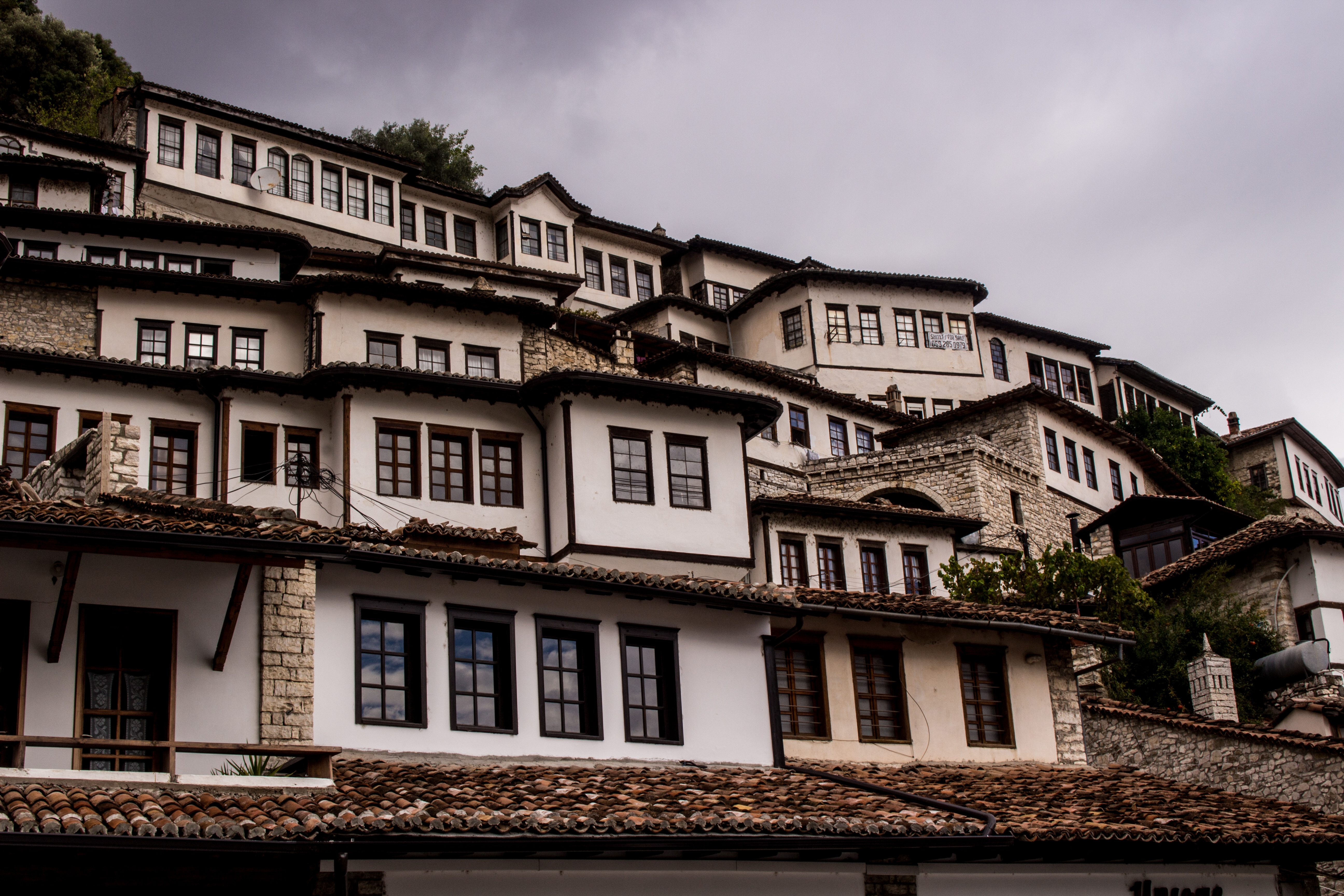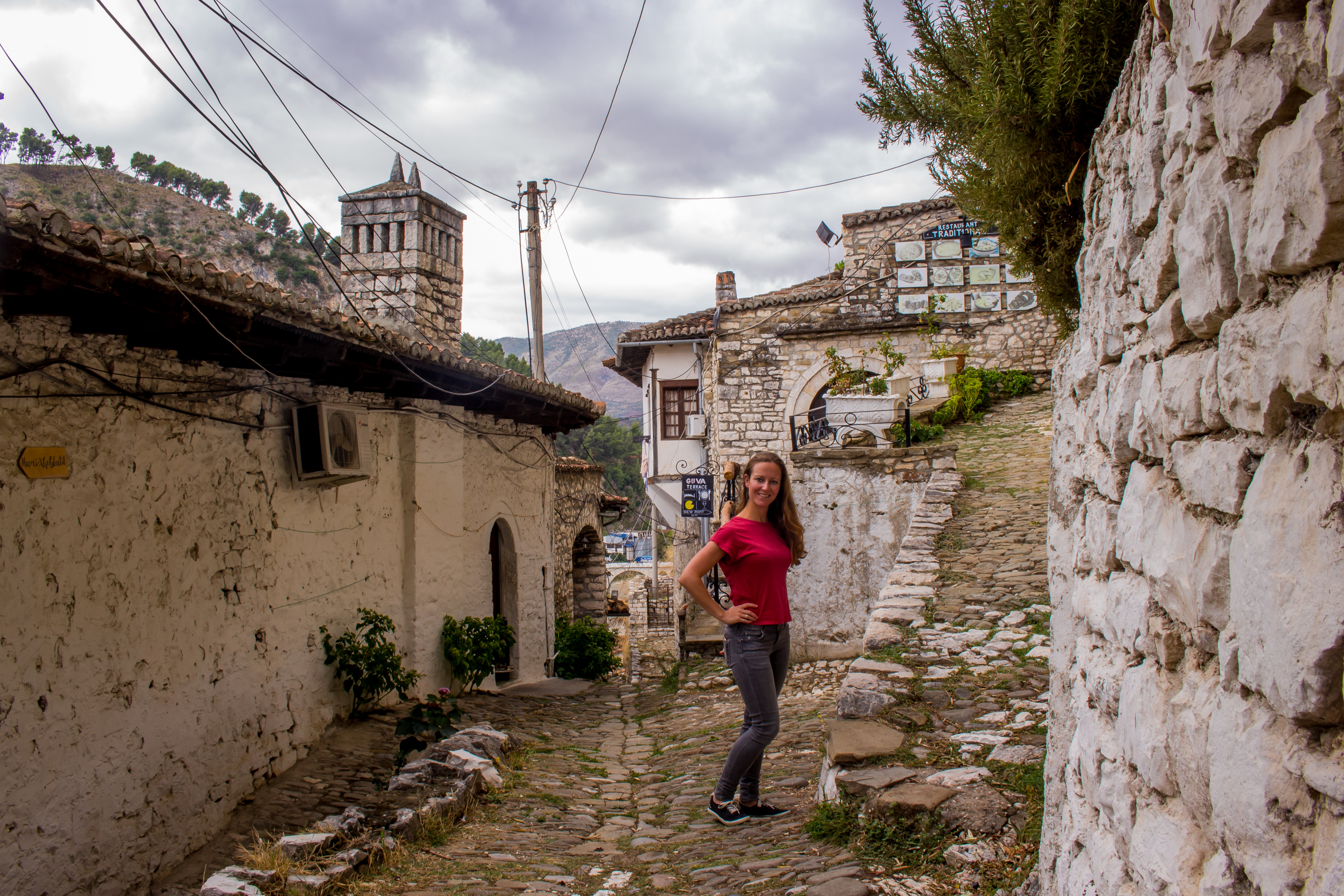 The next morning, I picked up a car and went on the road. In Montenegro I had traveled by bus, but I wanted to see as much as possible during my few days in Albania. The big disadvantage of driving was definitely not being able to take pictures from the car, as driving in Albania felt quite special to me. Next to the road, there were sometimes people walking with cows, once with a group of turkeys, and some horse carriages as well. I first drove towards the mountains with Berat as a first stop. Berat, also known as the city of a thousand windows. The city is built on the hills surrounding the Osum River and consists of white Ottoman style houses. Because they are all one above the other, it is quite clear where the nickname comes from: there seem to be thousands of windows indeed. I went up to the castle of Berat, which is a fortress on top of one of the hills. It is a very special place, a mixture of ruins and inhabited houses.