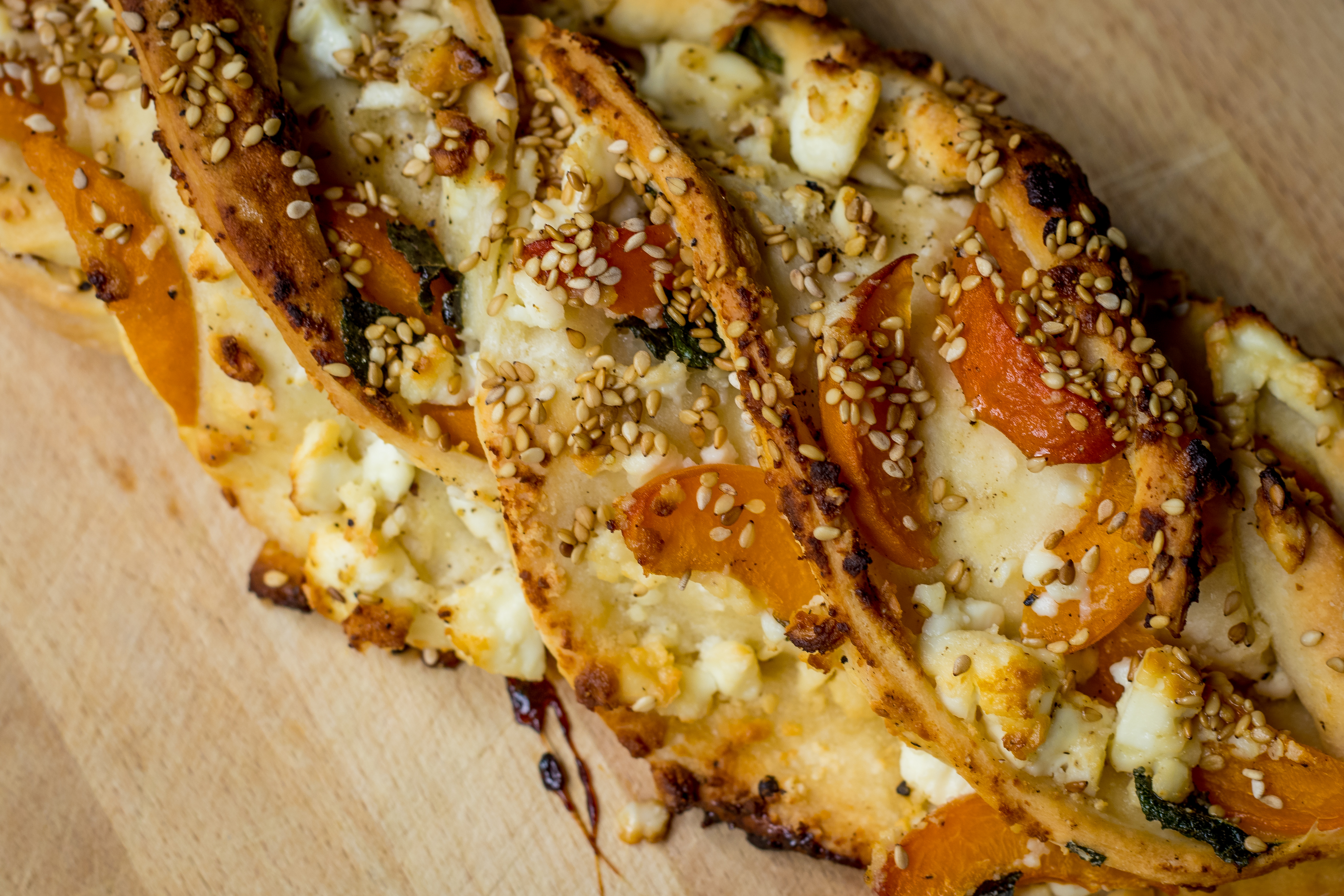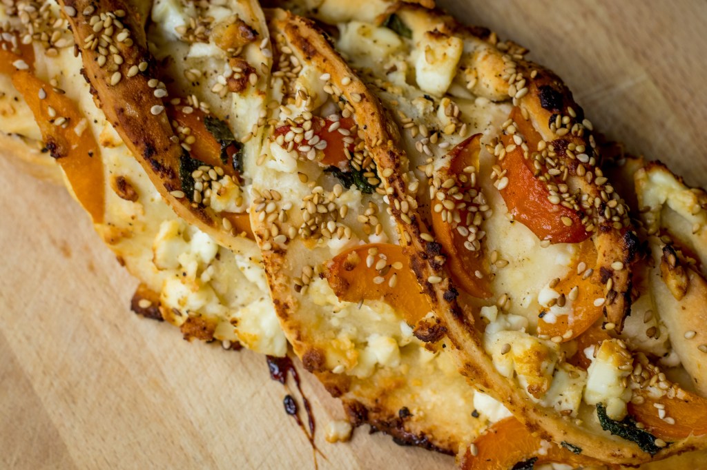 Once the dough has rested, roll it out with a rolling pin to a thin circle. It should be around 3 mm thick. Crumble the feta cheese between your hands and spread it out all over the circle of dough. Wash the apricots and take the stones out. Slice both of them in thin slices and also spread those out over the dough. Tear the mint leaves in pieces and add on top. Finally, divide the honey all over the circle and add a good pinch of black pepper.
