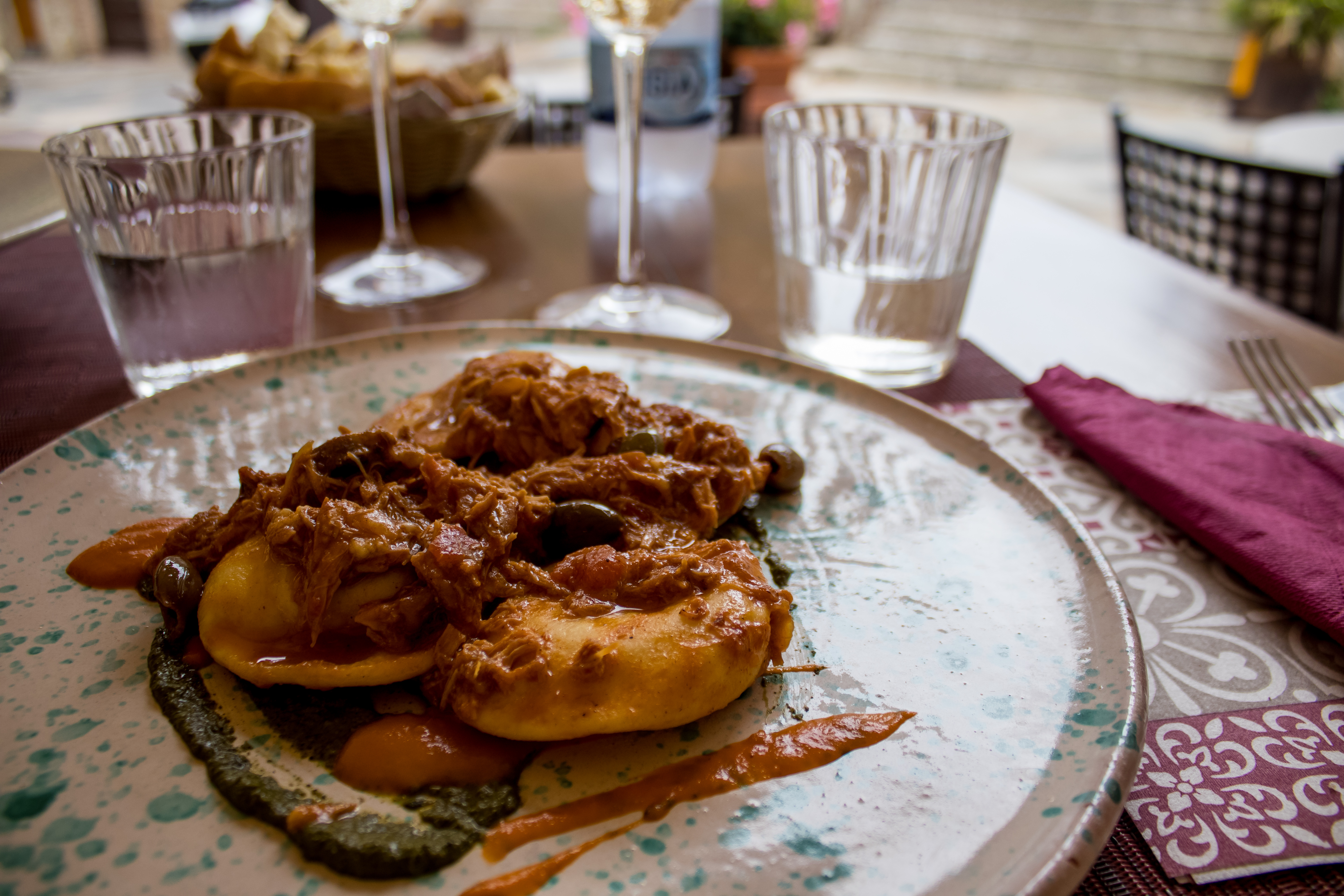 After a short drive from the airport, we parked the car at the foot of the medieval city. I had not been in Italy for a while and Tuscany was definitely years ago. So I was quite excited to explore the towns, the country side and of course the food and wine. We walked through the small old town of Colle di vall d’Elsa and spent time enjoying the old churches and some massive cacti in the quiet town. It was still early but we decided to have lunch before moving on to the next place. As it turned out, that was a great idea. We sat down on the terrace, as almost the only ones there. But before finishing the starter many more people had joined. In my case, I had an eggplant mouse with tomato sauce as a first course. A very well made play on the classic eggplant parmigiana dish. The first course was good, the second was spectacular: fresh ravioli filled with potato and pecorino cheese, combined with a rabbit ragu and a bit of pesto. With this start of the holiday, I could only be excited about what the rest of the time there would bring.