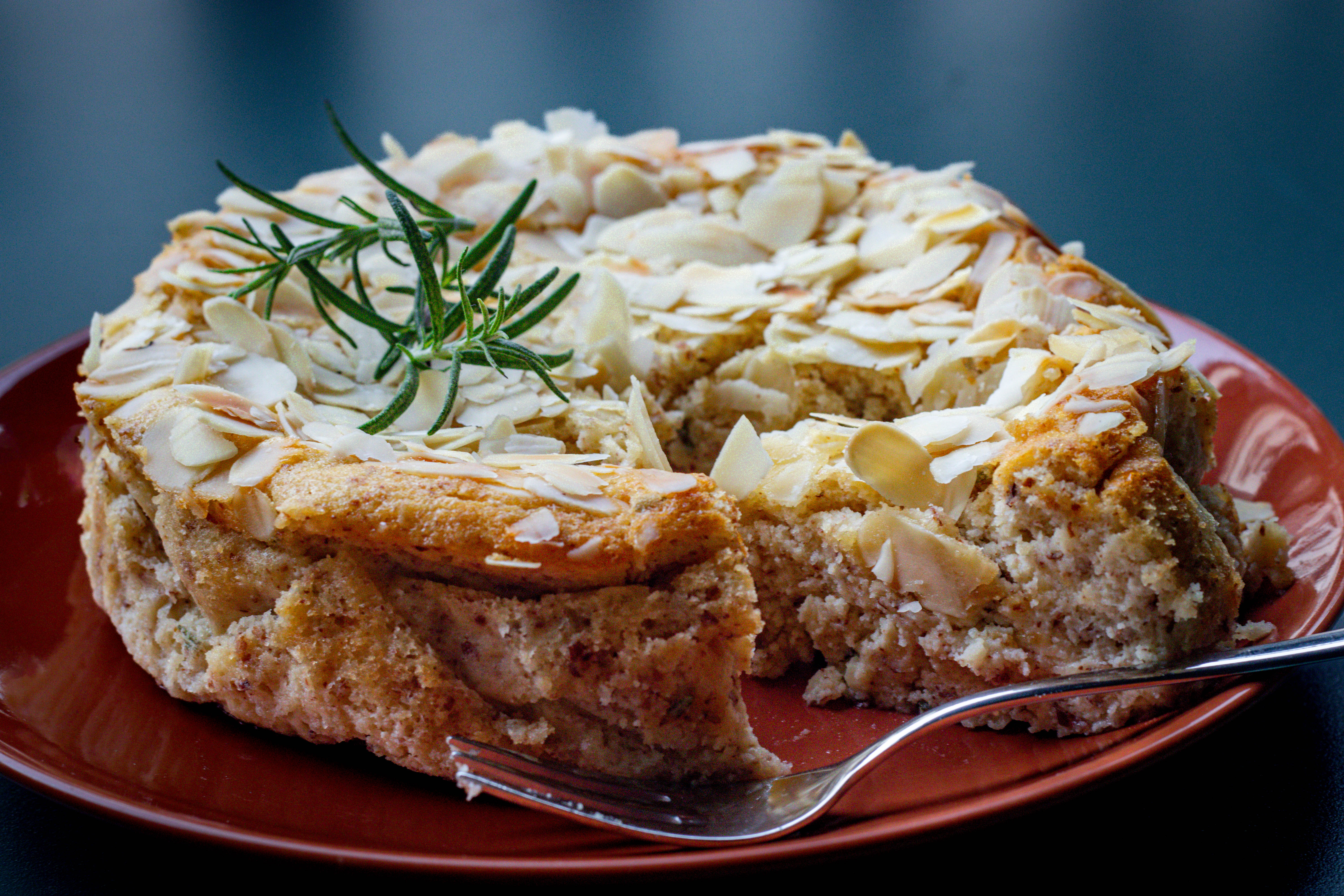Scoop the batter into the prepared cake pan. Decorate the top with the shaved almonds and carefully place the cake pan into the oven. Bake for around 45 minutes. The cake should still be wobbly, but a toothpick should come out clean. Let the cake cool down first to room temperature before placing it in the fridge for a couple of hours to set. Enjoy!